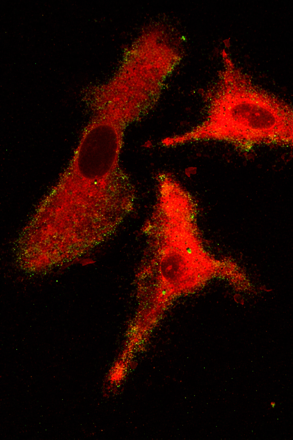 Fluorescence microscopy image of cultured cells following exposure to isotope-labelled nanoparticles. Cells are visualised in the red channel, highlighting the cytoplasmic region and nuclear morphology. The green fluorescence represents isotope-labelled nanoparticles. Discrete green puncta are observed associated with the cell periphery and distributed within the cytoplasmic space, suggesting membrane interaction and intracellular localisation of the nanoparticles. The spatial distribution of the green signal relative to the red cellular stain indicates close association with the plasma membrane and internal compartments, consistent with cellular uptake following nanoparticle exposure.